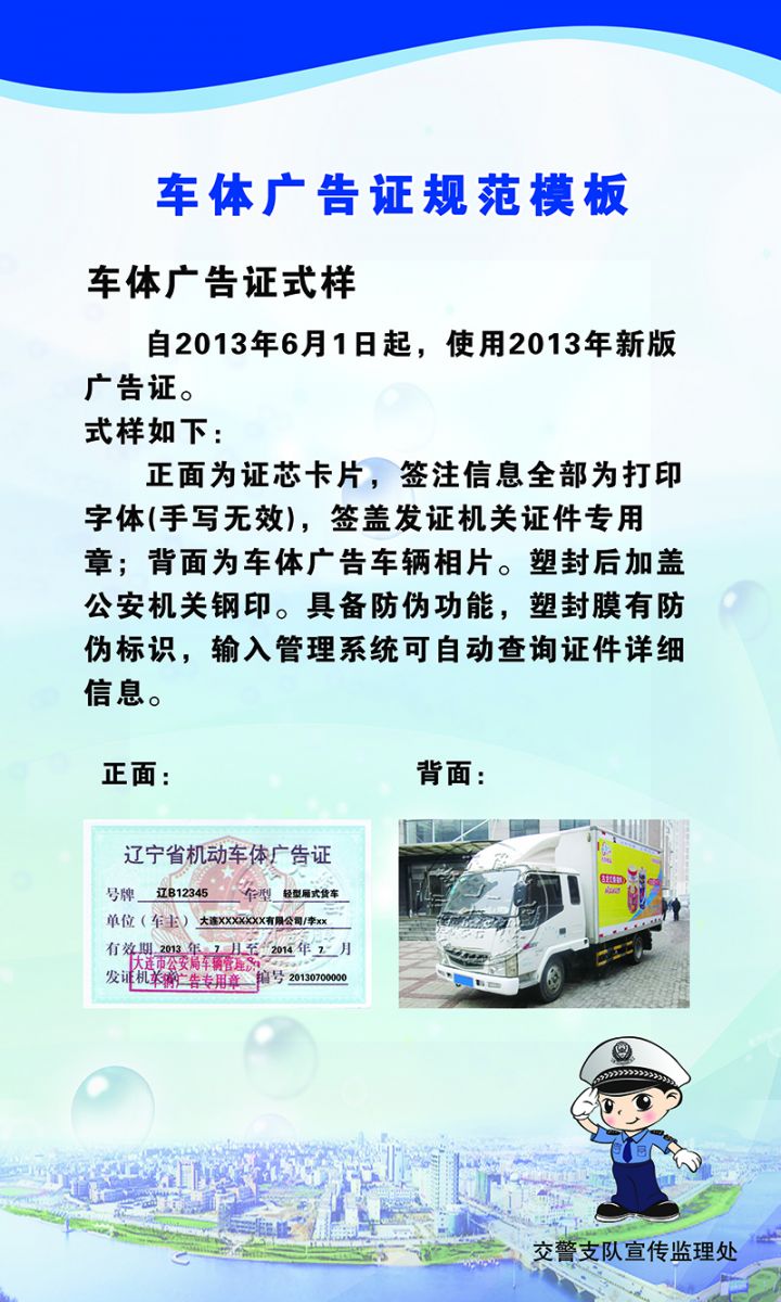 1、自2013年6月9日大連市車輛管理所啟用了新版的車體廣告證,2013年7月1日正式實施。